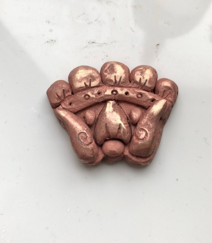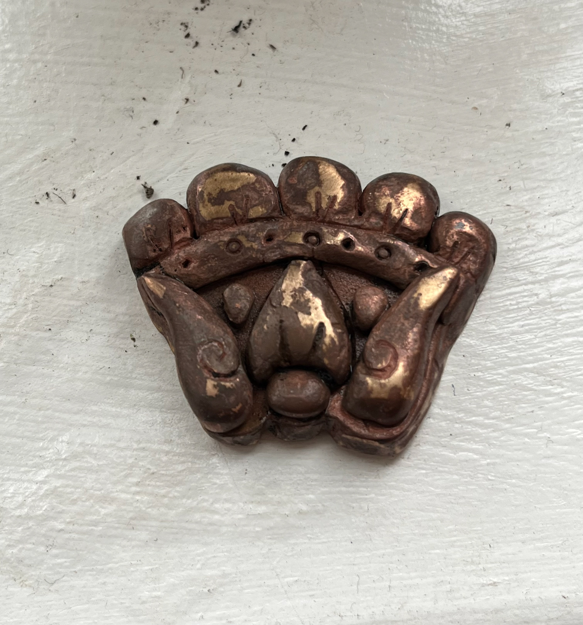 The image on the left shows my patina on the repousse piece I made and I really liked the effect the patina made on a change in relief as it looked like lichen, letting the patina develop in its own way like an organism. However, for reasons I am still trying to figure out, the patina started to crack and flake off. This was really upsetting as I had never seen the patina behave in this way but as soon as I took it out to dry it all started to fall off. I tried saving it with a sealant to make it all stick together, but that failed too and then I was left with a crusty looking piece.