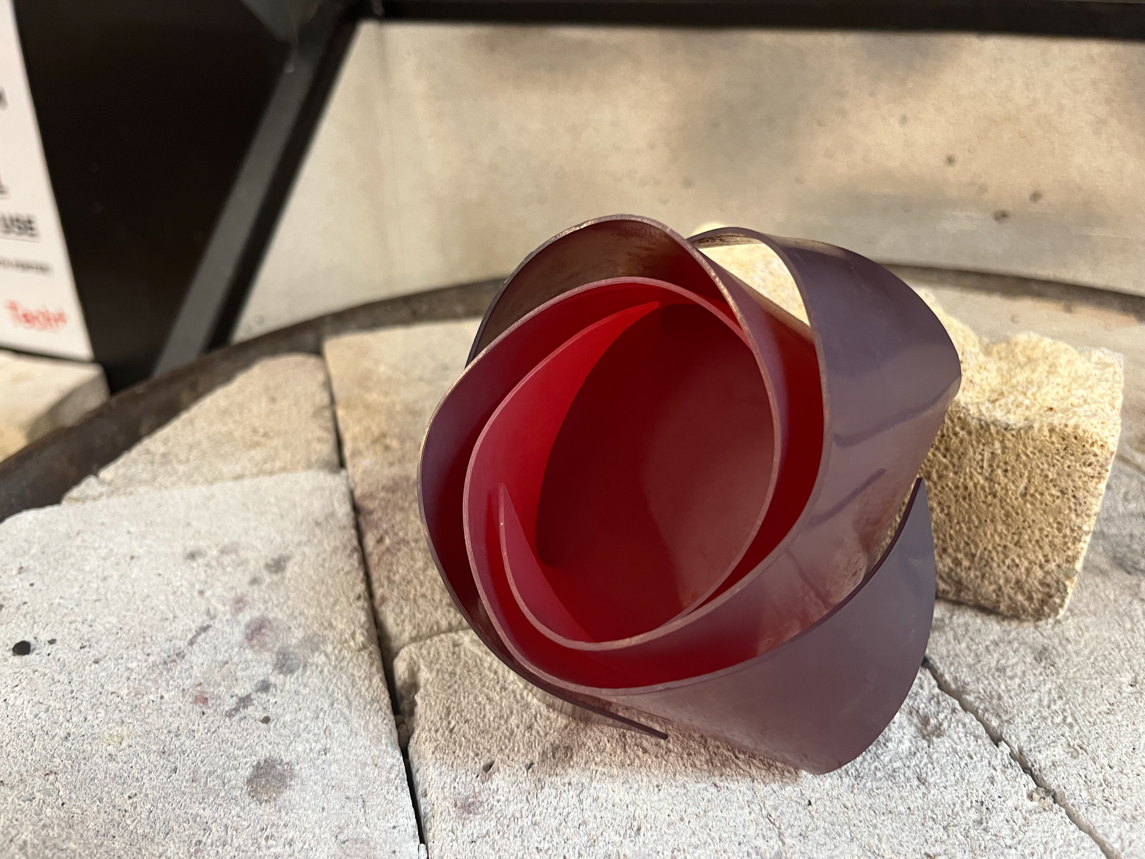 I am happy how these boxes turned out and the colours really pop when they are nesting. Furthermore, the images above of the large box with the ammonia, unintentionally patinad the outside with this swirly, fluid stains. This was caused by the vinyl as it it left pockets of air where the ammonia seeped through the cracks leaving this fluid patina. I really like this and want to continue developing this for my final piece. Letting the patina do its own thing, and control it less.