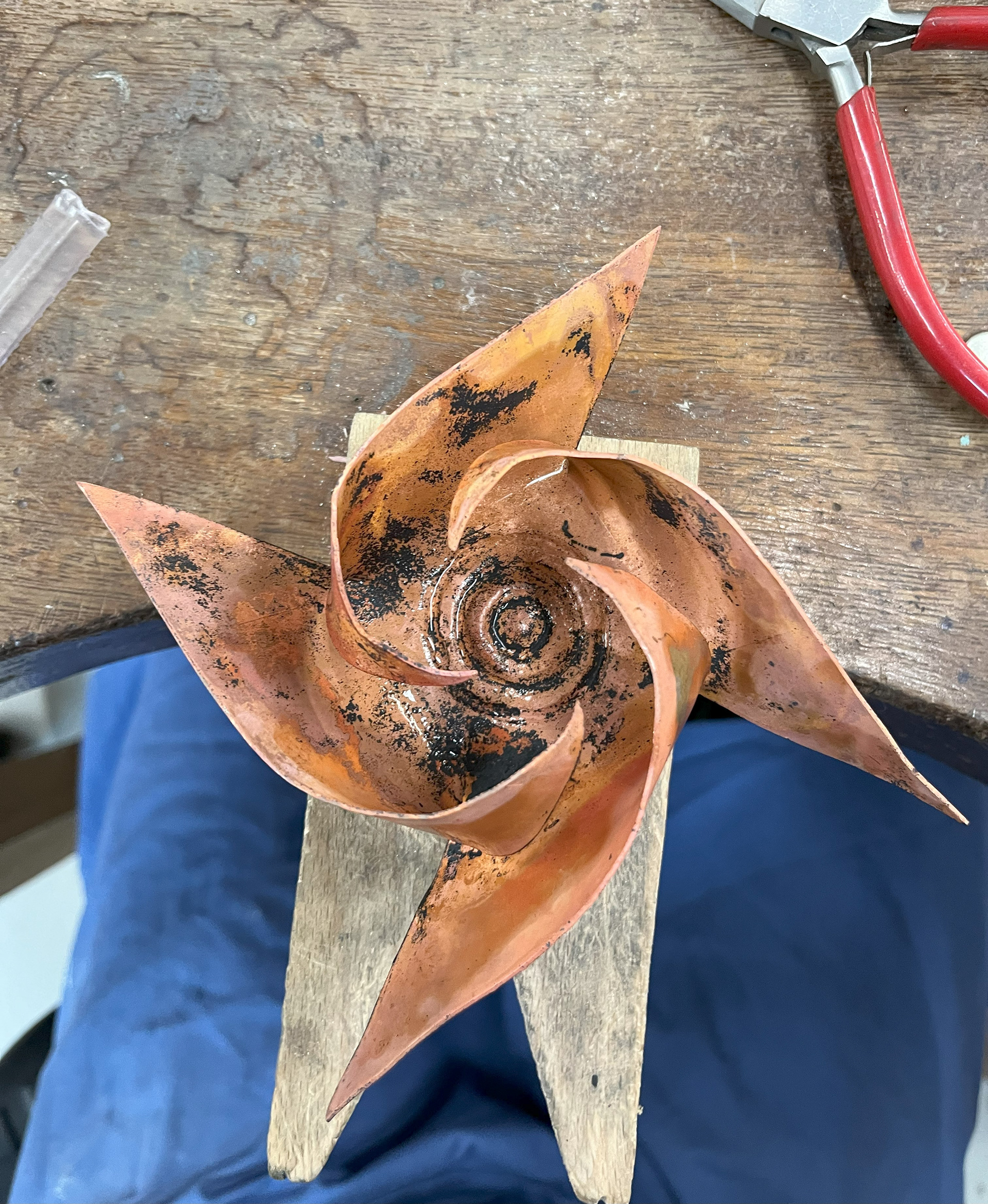 It was another day in the workshop and I was annealing one if my pieces when I saw the surface colour of the copper change from red to silver to black. This usually doesn’t surprise me as it is the typical colour change when heating copper but then I realised… heat treating!