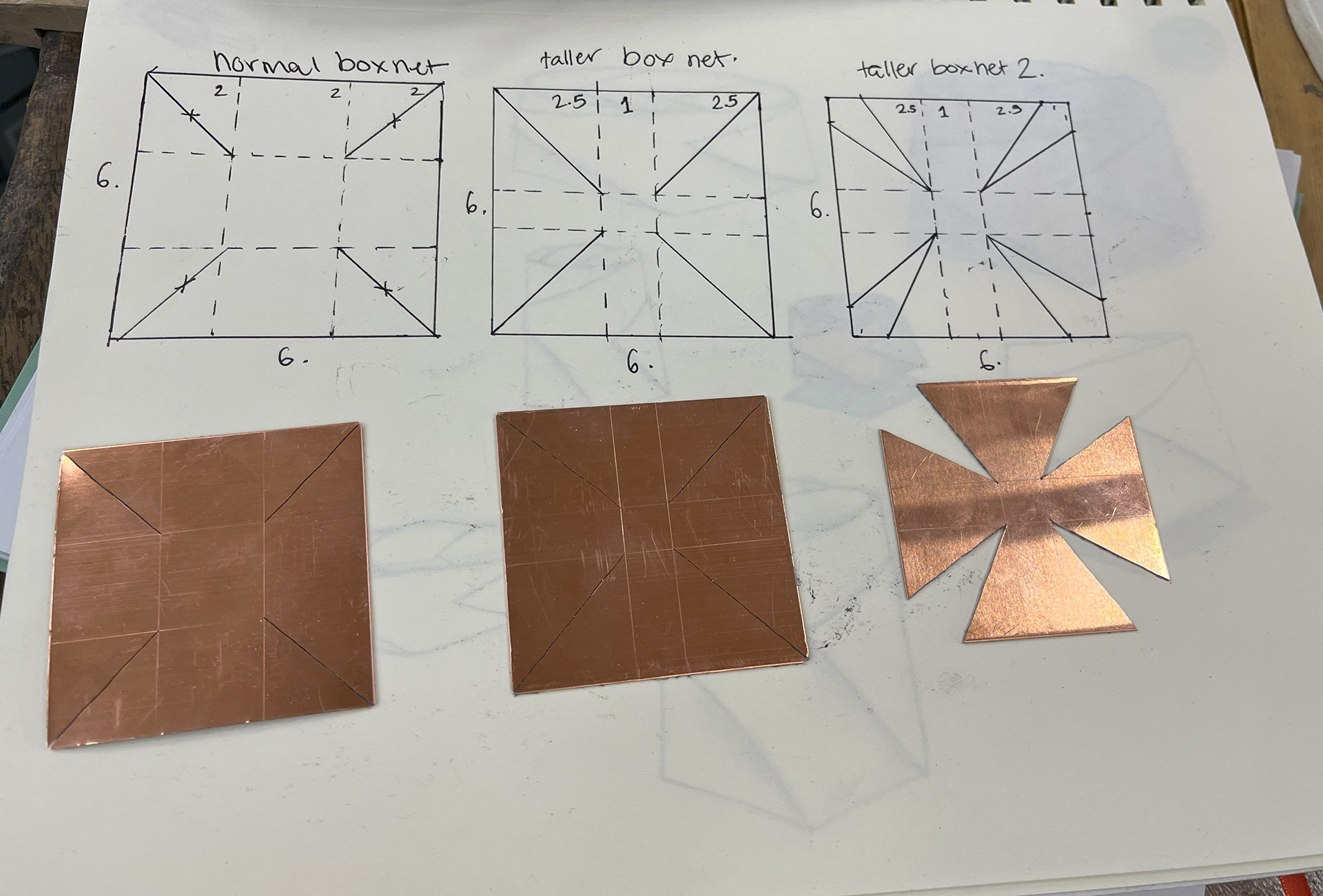I first wanted to explore what different shapes I could create with a 60x60mm and 0.7mm thickness copper sheet. I drew out in my sketch book the original box net, 2 taller box nets and a short box net. I was delighted to see the interesting vessel forms come from the same sized sheet.