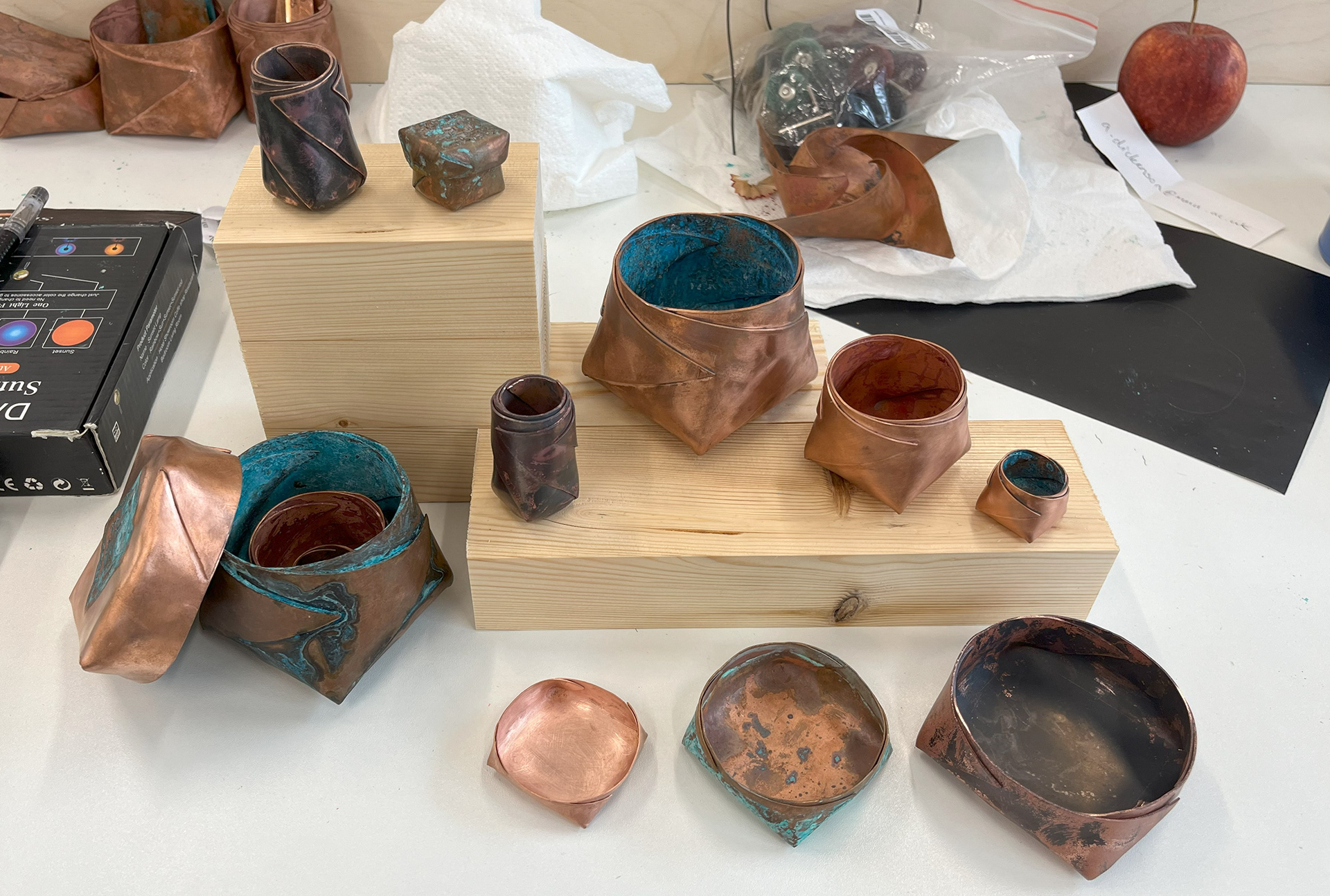 I have thought a lot about what context I should put my pieces in. My objects don’t have a real purpose and are really just decorative. I think I would like my vessels to be in the home, domestic yet ornamental. As they are vessels, I have thought about how they could be used in a functional manner. But ultimately thought that it would cheapen them if I allocated a specific function. Furthermore, putting them to use like turning them into vases, containers or plant pots could damage the patina over time. Copper tarnishes easily and when over touched or used can dull the colour or even start to rub the patina away. I would like my pieces to remain frozen in time and to retain their shine and beauty.